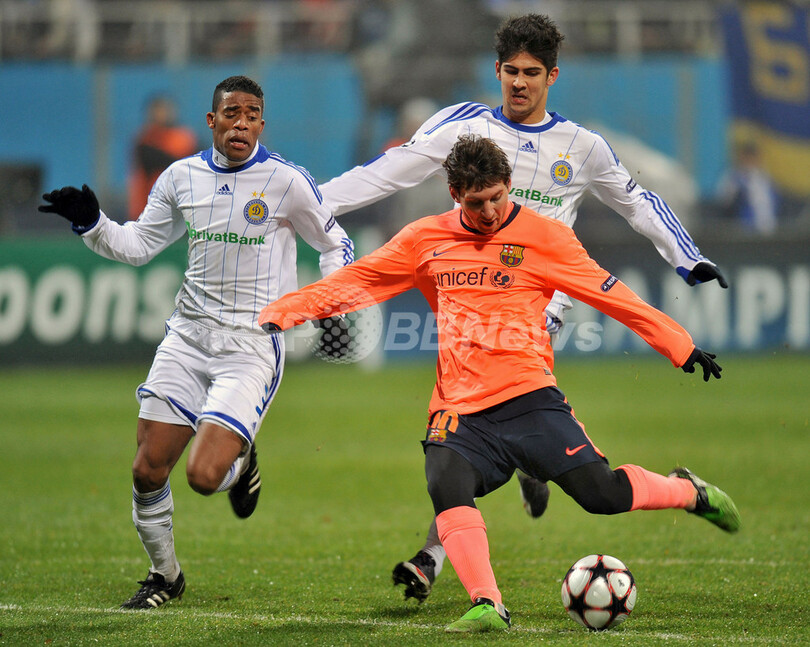 【12月10日 AFP】(記事更新、写真追加)サッカー欧州チャンピオンズリーグ2009-10(UEFA Champions League 2009-10)グループリーグF第6節、ディナモ・キエフ(Dynamo Kiev)対FCバルセロナ(FC Barcelona)。試合はリオネル・メッシ(Lionel Messi)が決勝点を挙げた王者バルセロナが2-1で勝利し、グループ首位で決勝トーナメント進出を決めた。