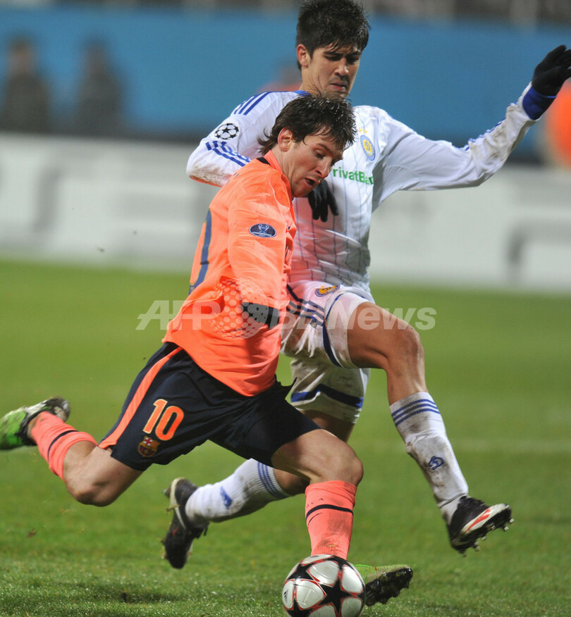 しかしバルセロナは、前半33分にエリック・アビダル(Eric Abidal)のクロスからシャビ・エルナンデス(Xavi Hernandez)が得点し1-1の同点に追いつくと、後半41分にはメッシがフリーキック(FK)を直接ゴールに決めてディナモ・キエフの望みを打ち砕いた。(c)AFP