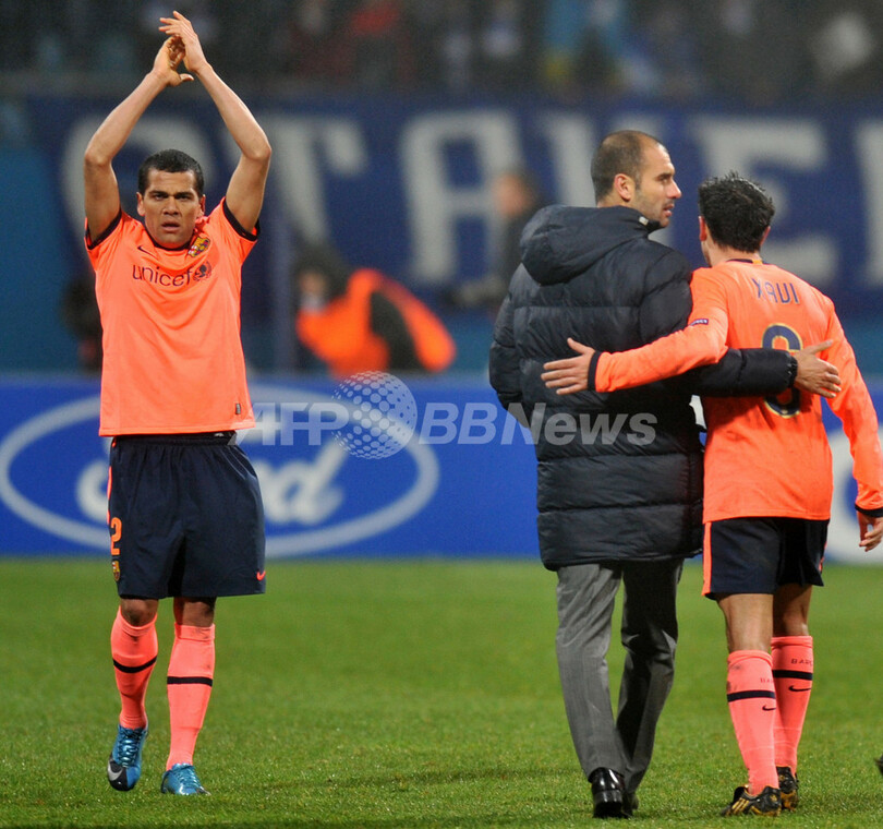 しかしバルセロナは、前半33分にエリック・アビダル(Eric Abidal)のクロスからシャビ・エルナンデス(Xavi Hernandez)が得点し1-1の同点に追いつくと、後半41分にはメッシがフリーキック(FK)を直接ゴールに決めてディナモ・キエフの望みを打ち砕いた。(c)AFP