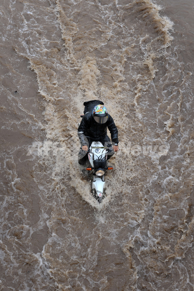 写真は、サンパウロ北部の冠水したMarginal Tiete高速道路を通過するオートバイ(2009年12月8日撮影)。(c)AFP/Mauricio LIMA