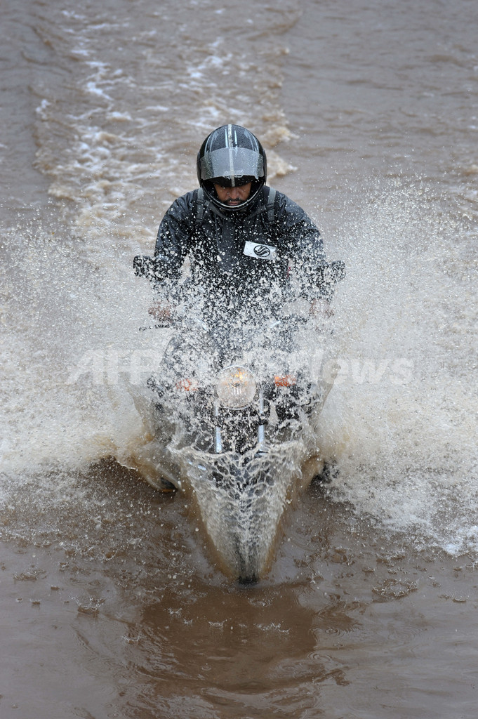 写真は、サンパウロ北部の冠水したMarginal Tiete高速道路を通過するオートバイ(2009年12月8日撮影)。(c)AFP/Mauricio LIMA