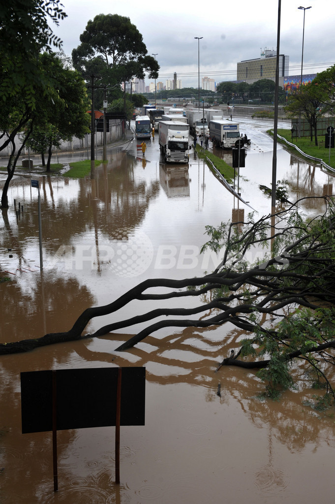 ブラジルのサンパウロ(Sao Paulo)で8日、激しい雨があり、チエテ(Tiete)川やピニェイロス(Pinheiros)川が氾濫(はんらん)し、市内の道路が冠水するなどの被害が起きている。大雨の影響で、これまでに少なくとも4人が死亡、市内を通過する幹線道路では120キロメートルの交通渋滞が起きた。