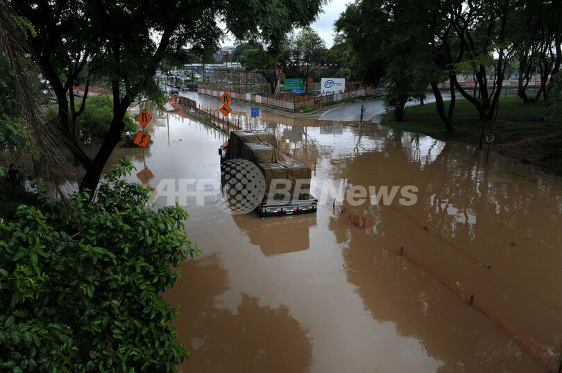ブラジルのサンパウロ(Sao Paulo)で8日、激しい雨があり、チエテ(Tiete)川やピニェイロス(Pinheiros)川が氾濫(はんらん)し、市内の道路が冠水するなどの被害が起きている。大雨の影響で、これまでに少なくとも4人が死亡、市内を通過する幹線道路では120キロメートルの交通渋滞が起きた。