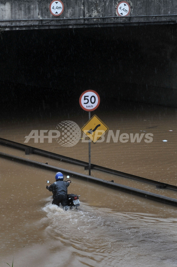 ブラジルのサンパウロ(Sao Paulo)で8日、激しい雨があり、チエテ(Tiete)川やピニェイロス(Pinheiros)川が氾濫(はんらん)し、市内の道路が冠水するなどの被害が起きている。大雨の影響で、これまでに少なくとも4人が死亡、市内を通過する幹線道路では120キロメートルの交通渋滞が起きた。