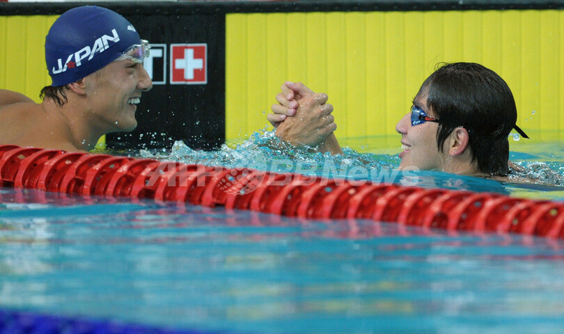 また、藤井拓郎(Takuro Fujii)が100メートル自由形を48秒76、100メートルバタフライを51秒51で制し、この日だけで二つの金メダルを獲得している。(c)AFP/Peter Stebbings