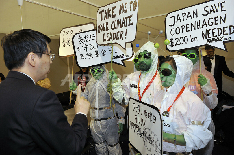 【12月11日 AFP】日本こそが地球温暖化対策の希望――。デンマーク・コペンハーゲン(Copenhagen)で開かれている国連気候変動枠組条約(UN Framework Convention on Climate Change、UNFCCC)第15回締約国会議(COP15)の会場で10日、緑色の顔に触覚のついたエイリアンが日本代表団に「温暖化対策のリーダーシップを取ってほしい」と訴える一幕があった。