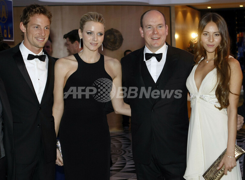 国際自動車連盟(%%Federation Internationale de l'Automobile%%、%%FIA%%)の年間表彰式が11日、モナコ(Monaco)で開催された。写真はカメラに向けてポーズをとる(左から)フォーミュラワン(F1世界選手権、F1)年間王者のジェンソン・バトン(%%Jenson Button%%)、モナコ元首アルベール2世(%%Prince Albert II%%)公の恋人で水泳選手のチャーリーン・ウィットストック(%%Charlene Wittstock%%)、アルベール2世公、バトンの恋人でモデルの道端ジェシカ(%%Jessica Michibata%%)。(2009年12月11日撮影)(c)AFP/ERIC GAILLARD