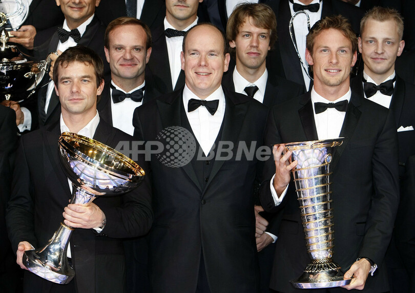 国際自動車連盟(%%Federation Internationale de l'Automobile%%、%%FIA%%)の年間表彰式が11日、モナコ(Monaco)で開催された。写真はモナコ元首アルベール2世(%%Prince Albert II%%)公とともにポーズをとる世界ラリー選手権(%%WRC%%)年間王者のセバスチャン・ローブ(%%Sebastien Loeb%%、左)とフォーミュラワン(F1世界選手権、F1)年間王者のジェンソン・バトン(%%Jenson Button%%、右)。(2009年12月11日撮影)(c)AFP/ERIC GAILLARD