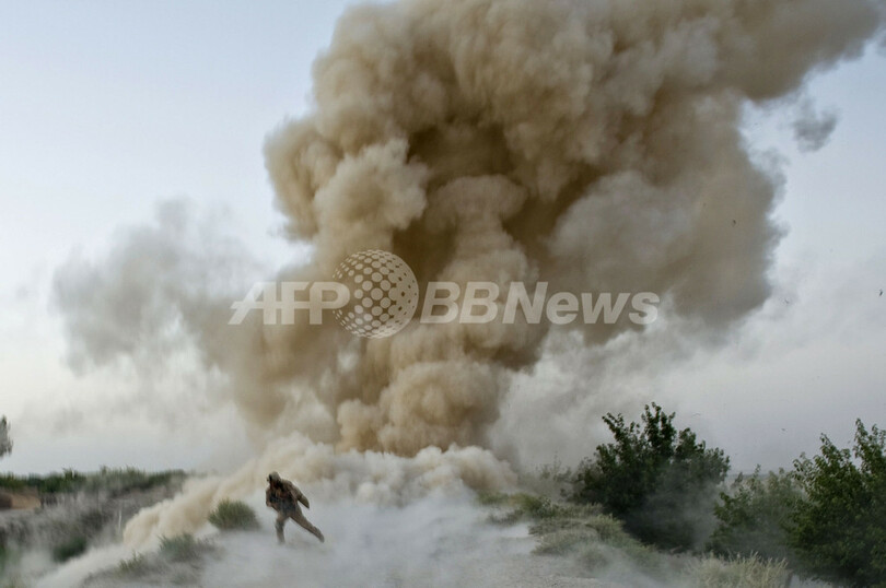 米軍は2009年7月1日夜、アフガニスタンの旧支配勢力タリバン(Taliban)が拠点とする同国南部ヘルマンド(Helmand)州で、海兵隊4千人を投入する大規模な「剣の一撃作戦(Operation Khanjar)」を開始した。8月20日の同国大統領選挙と州議会選を前にタリバンを拠点から追放したいとの狙いがあった。作戦中、即席爆発装置(IED)の爆発による米兵の死亡が相次いだ。写真はへルマンド州ガルムシール(Garmsir)地区で、IEDが爆発した瞬間(2009年7月13日撮影)。(c)AFP/Manpreet ROMANA