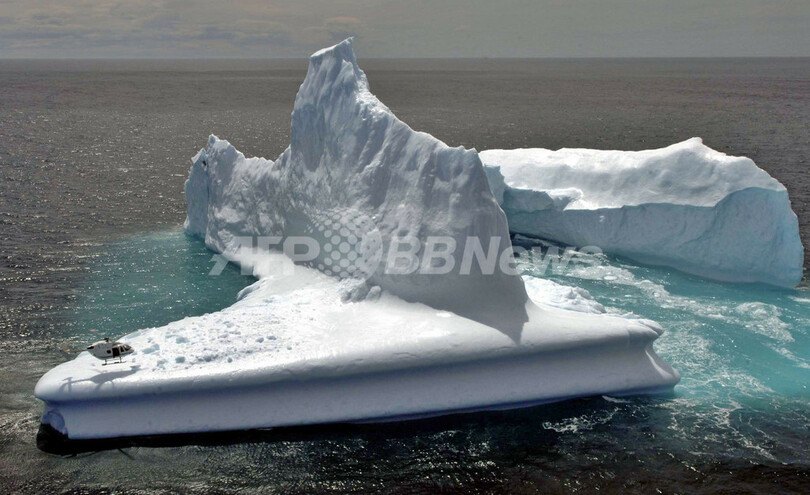 2006年、ニュージーランド沖に過去75年間で最も近い地点まで南極大陸の氷山が漂着した。写真は11月15日時点、ニュージーランド南東オタゴ(Otago)沿岸のダニーディン(Dunedin)沖約100キロ付近に浮かぶ南極の氷山と、観光客7人を乗せたヘリコプター(2006年11月16日撮影)。(c)AFP/STEPHEN JAQUIERY