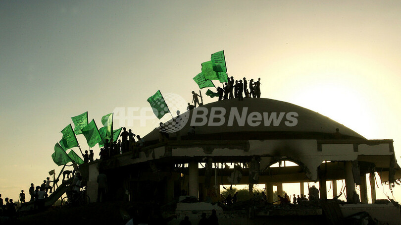 写真はネツァリムで破壊されたシナゴーグの屋根に掲げられるイスラム原理主義組織ハマス(Hamas)の旗(2005年9月12日撮影)。(c)AFP/THOMAS COEX