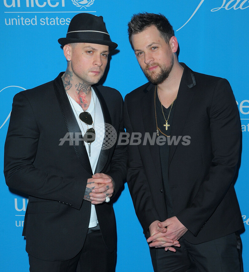 のビバリーウィルシャーホテル(Beverly Wilshire Hote)で開かれた「ユニセフボール(UNICEF Ball)」に出席した米ロックバンド「グッド・シャーロット(Good Charlotte)」のメンバーで、双子のベンジー・マッデン(Benji Madden、左)とジョエル・マッデン (Joel Madden)兄弟(2009年12月10日撮影)。(c)AFP/Getty Images/Jason Merritt
