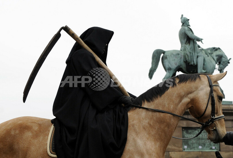 写真は、国際環境保護団体グリーンピース(Greenpeace)がコペンハーゲンの国会議事堂前で行った気候変動の抑止を訴えるデモで、「死神」に扮した参加者(2009年12月14日撮影)。(c)AFP/ADRIAN DENNIS