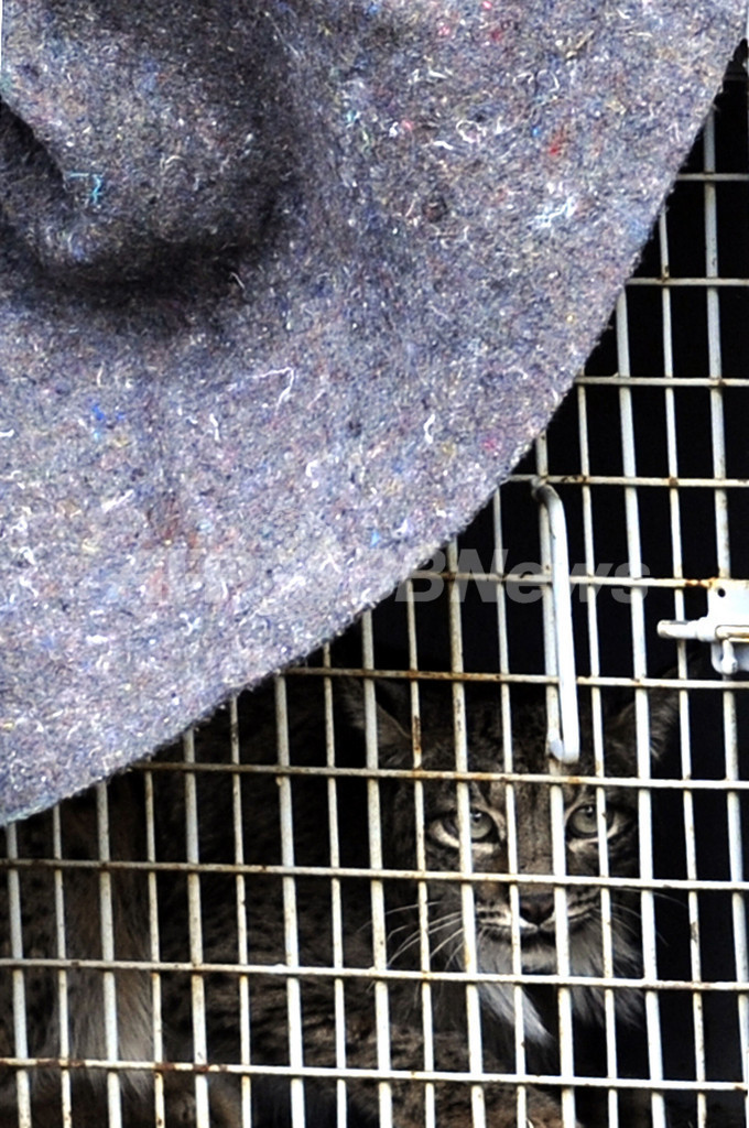 写真は、檻に入れられて運ばれるイベリアオオヤマネコ(2009年12月14日撮影)。(c)AFP/CRISTINA QUICLER