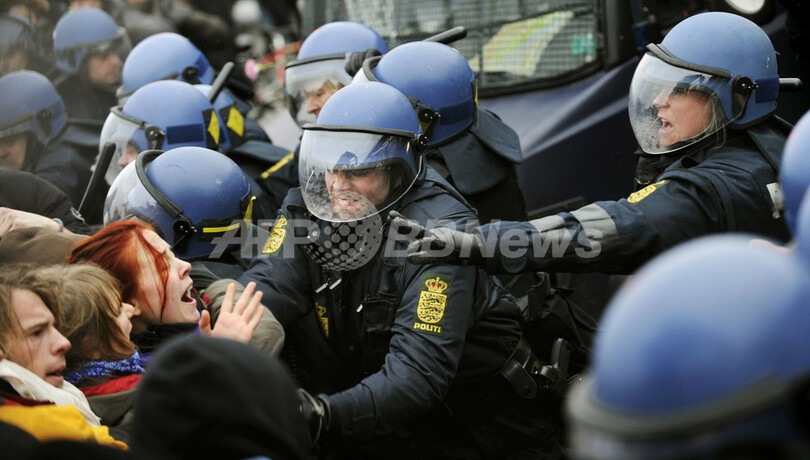 【12月17日 AFP】16日、デンマーク・コペンハーゲン(Copenhagen)で開催中の国連気候変動枠組み条約(UN Framework Convention on Climate Change、UNFCCC)第15回締約国会議(COP15)で、会場のベラ・センター(Bella Center)に突入を試みた環境保護活動家ら約2500人に、警官隊が催涙弾などで応酬、約260人が逮捕される騒ぎとなった。(c)AFP