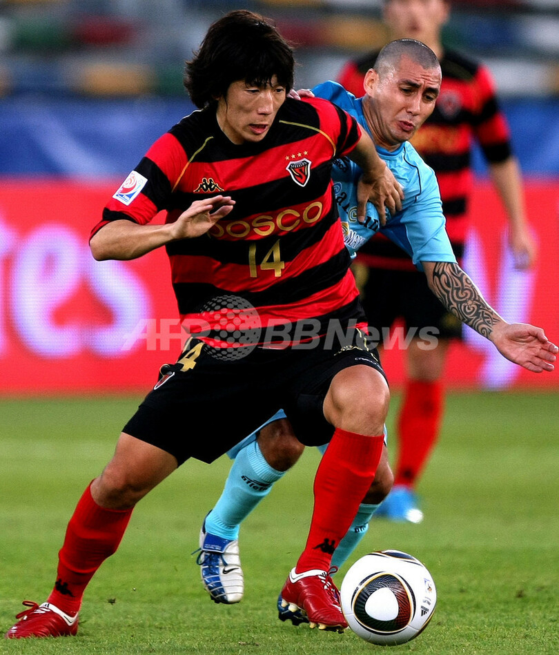 09クラブW杯(%%2009 FIFA Club World Cup%%)3位決定戦、浦項スティーラース(%%Pohang Steelers%%)対アトランテ(%%Atlante FC%%)。試合は1-1の同点で迎えたPK戦をスティーラースが4-3で制し、大会を3位で終えた。写真はアトランテのホセ・ゴンサレス(%%Jose Joel Gonzalez%%、右)とボールを競る浦項スティーラースの宋昌鎬(%%Chang-Ho Song%%、ソン・チャンホ)。(2009年12月19日撮影)(c)AFP/MARWAN NAAMANI