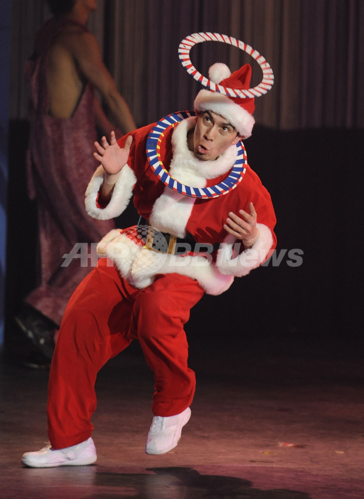 写真は、サンタクロース姿で、投げられた輪を頭でキャッチするパフォーマー(2009年12月19日撮影)。(c)AFP/Yoshikazu TSUNO