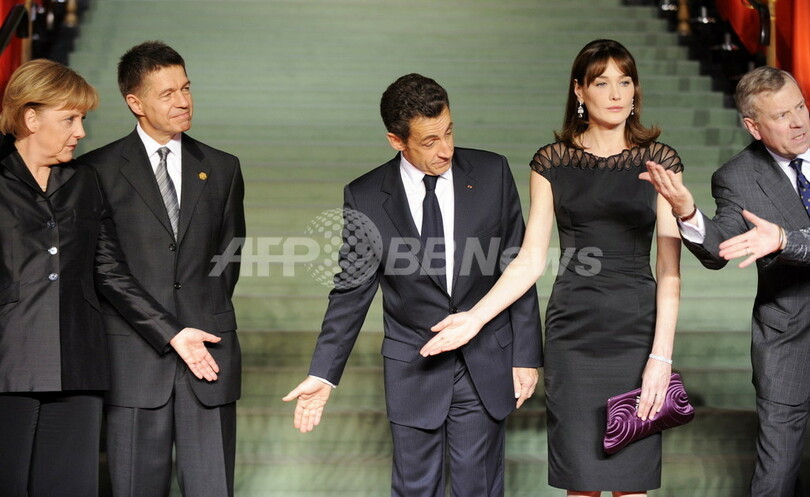 ドイツ・バーデンバーデン(Baden-Baden)で、北大西洋条約機構(North Atlantic Treaty Organisation、NATO)首脳会議を前に、各国代表団を出迎える(左から)アンゲラ・メルケル(Angela Merkel)独首相と夫のヨアヒム・ザウアー(Joachim Sauer)氏、ニコラ・サルコジ(Nicolas Sarkozy)仏大統領と夫人のカーラ・ブルーニ(Carla Bruni)さん、ヤープ・デホープスヘッフェル(Jaap de Hoop Scheffer)NATO事務総長(当時)ら(2009年4月3日撮影)。(c)AFP/DDP/MICHAEL KAPPELER