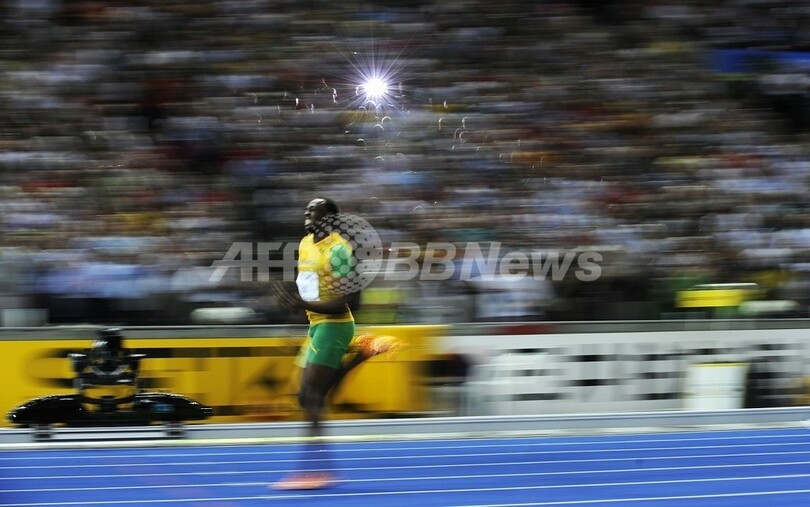 第12回世界陸上ベルリン大会(%%12th IAAF World Championships in Athletics Berlin%%)男子200メートル決勝で、北京五輪の同種目金メダリストで世界記録保持者のウサイン・ボルト(%%Usain Bolt%%、ジャマイカ)が、19秒19の世界新記録で優勝し、同じく世界新で制した16日の男子100メートルに続き2冠を達成した(2009年8月20日撮影)。(c)AFP/ADRIAN DENNIS