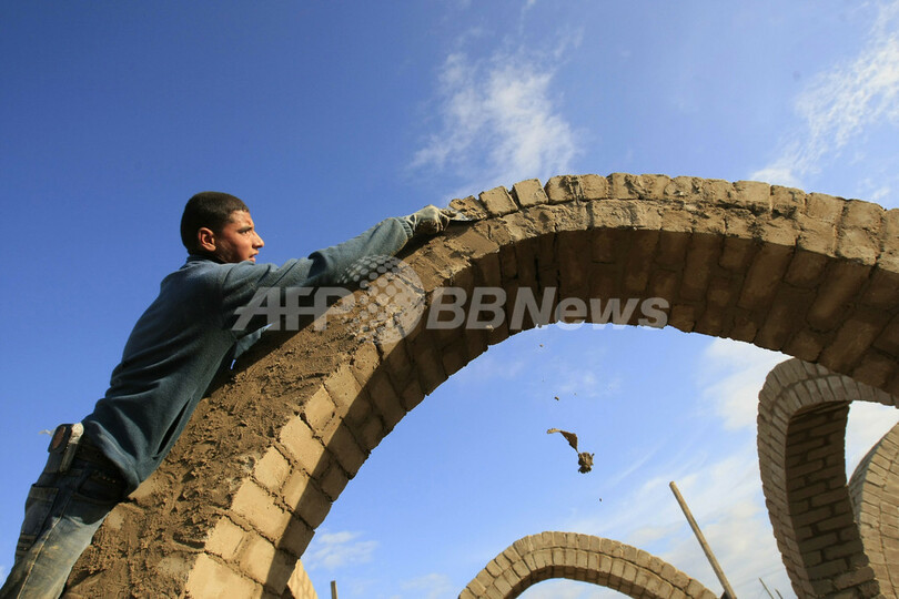 写真は、ガザ北部ジャバリア(Jabalia)の難民キャンプで、泥を使って家を建てる男性。ガザでは、イスラム原理主義組織ハマス(Hamas)の支配とイスラエルによる封鎖が続いており、がれきを再利用した復興はなかなか進んでいない(2009年12月14日撮影)。(c)AFP/MOHAMMED ABED