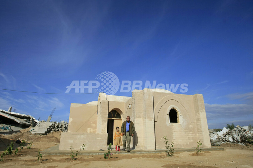 写真は、ガザ北部ジャバリア(Jabalia)の難民キャンプで、泥で建てた家の前に立つ男性と子ども。ガザでは、イスラム原理主義組織ハマス(Hamas)の支配とイスラエルによる封鎖が続いており、がれきを再利用した復興はなかなか進んでいない(2009年12月14日撮影)。(c)AFP/MOHAMMED ABED