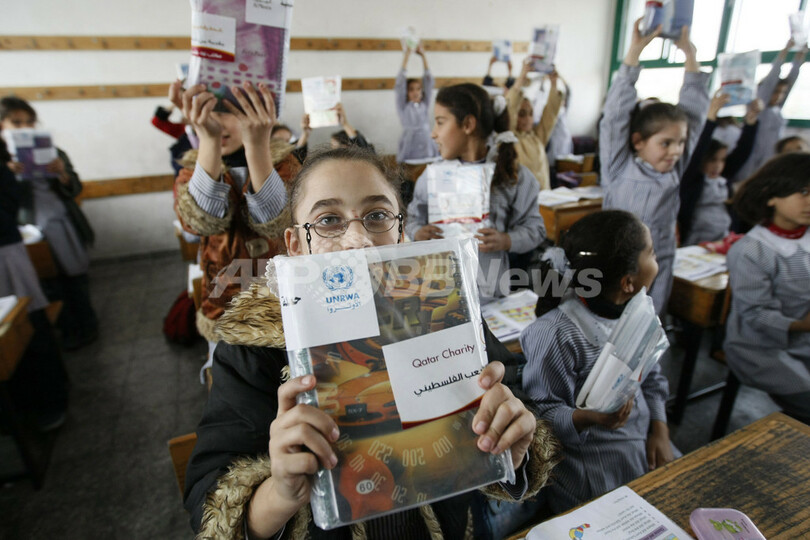 写真は、ガザ北部ベイトラヒヤ(Beit Lahia)にある国連パレスチナ難民救済事業機関(UNRWA)の援助で建てられた学校で、カタールの慈善団体が寄付した教科書を見せる少女。イスラエル軍の攻撃では、UNRWAの事務所や複数の学校も破壊された(2009年12月16日撮影)。(c)AFP/MOHAMMED ABED