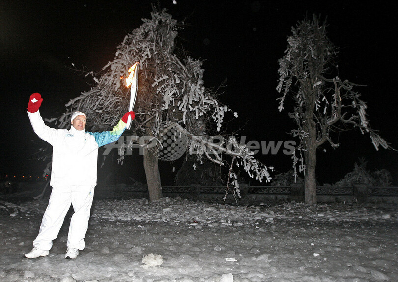 写真は、凍った木々の前で聖火トーチを掲げる元自転車競技選手のゴードン・シングルトン(Gordon Singleton)氏(2009年12月20日撮影)。(c)AFP/Getty Images/Abelimages