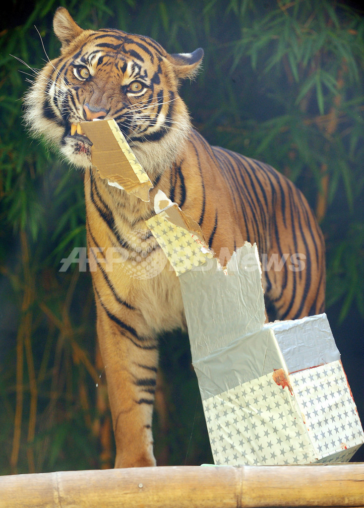 ニュース ライフ こぼれ話 動物園のトラにもクリスマスプレゼント、豪シドニー・タロンガ動物園 2009年12月23日 14:10 発信地:シドニー/オーストラリア [ アジア・オセアニア オーストラリア ] このニュースをシェア ‹ › ❮ 2/2 ❯ オーストラリア・シドニー(Sydney)のタロンガ動物園(Taronga Zoo)で、クリスマスプレゼントとして贈られた特製アイスの入った箱を食いちぎるスマトラトラの「Jumilah」(2009年12月23日撮影)。(c)AFP/Torsten BLACKWOOD 画像作成中 ! 【12月23日 AFP】オーストラリア・シドニー(Sydney)のタロンガ動物園(Taronga Zoo)で23日、園内の動物たちにクリスマスのごちそうが振る舞われた。これは毎年の恒例行事で、動物たちの探求心を呼び覚ます行動エンリッチメントプログラムの一環として行われている。(c)AFP ライフ 一覧へ> メディア・報道関係・法人の方向け 写真・動画 購入のお問合せ>