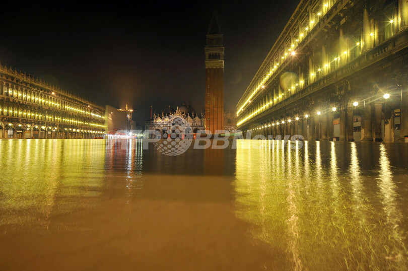 写真は、冠水したサンマルコ広場(Piazza San Marco、2009年12月23日撮影)。(c)AFP/ANDREA PATTARO
