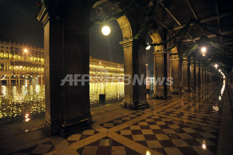 写真は、冠水したサンマルコ広場(Piazza San Marco、2009年12月23日撮影)。(c)AFP/ANDREA PATTARO