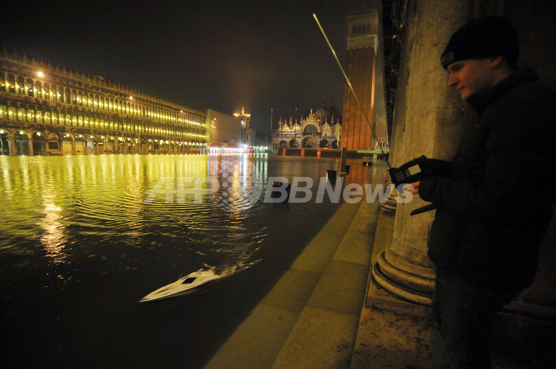 写真は、冠水したサンマルコ広場(Piazza San Marco)でラジコンのボートを操縦する男性(2009年12月23日撮影)。(c)AFP/ANDREA PATTARO