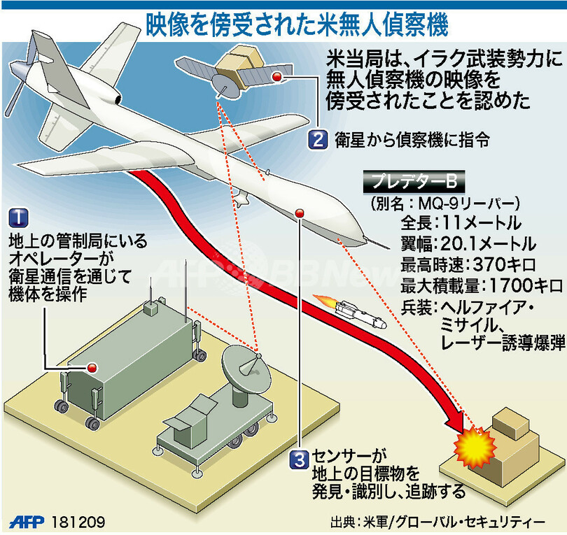 【12月24日 AFP】イラクの武装勢力が安価なソフトウエアを用いて、米軍の無人偵察機の伝送映像を傍受していたことが明らかになった。図は、無人偵察機について示したもの。(c)AFP