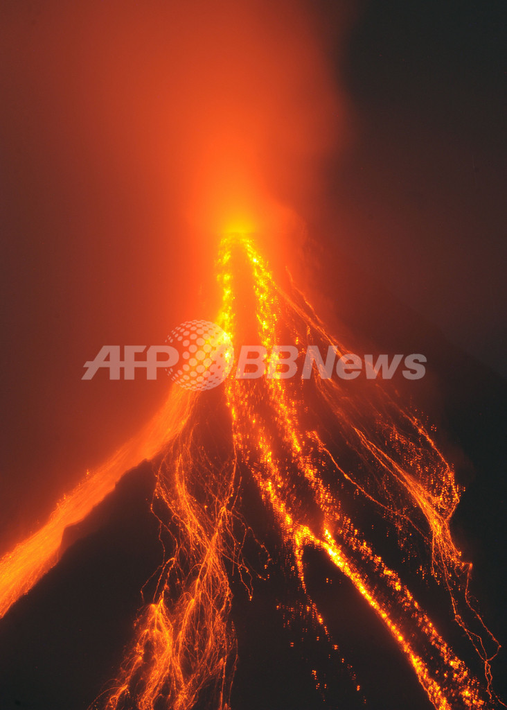 写真は、フィリピン・レガスピ(Legazpi)から撮影した、マヨン山から流出する溶岩(2009年12月24日撮影)。(c)AFP/TED ALJIBE