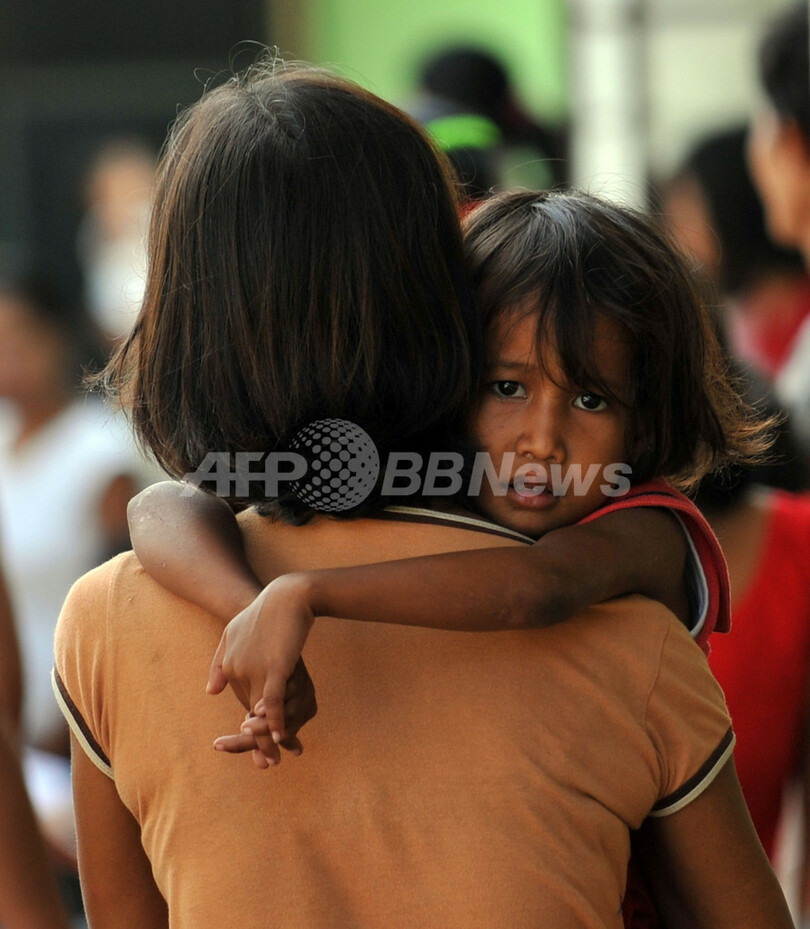 写真は、フィリピン・レガスピ(Legazpi)の避難所で、支援物資の配布を待つ母子(2009年12月25日撮影)。(c)AFP/TED ALJIBE