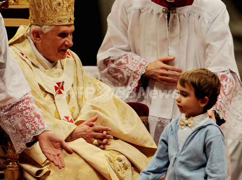 【12月25日 AFP】(写真追加)バチカンのサンピエトロ(St. Peter's)大聖堂で24日夜、ローマ法王ベネディクト16世(Benedict XVI、82)が恒例のクリスマスイブのミサを行うため入場した際、参列者の女性に飛び掛かられ、転倒した。