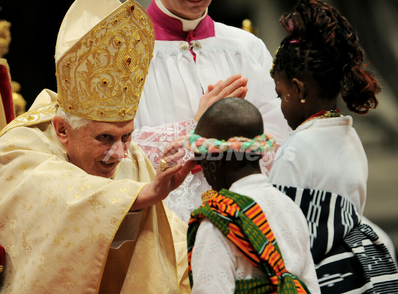 【12月25日 AFP】(写真追加)バチカンのサンピエトロ(St. Peter's)大聖堂で24日夜、ローマ法王ベネディクト16世(Benedict XVI、82)が恒例のクリスマスイブのミサを行うため入場した際、参列者の女性に飛び掛かられ、転倒した。