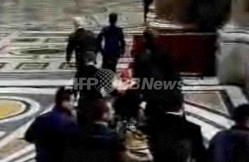 衛星放送スカイニューズ(Sky News)が報じた映像には、赤い服を着た女性が警備の柵を跳び越え、警備を振り切って、30人の枢機卿を率い金の十字架を掲げて祭壇まで行進する法王の首のあたりの衣服をつかみ、引っ張り倒す様子が映っている。