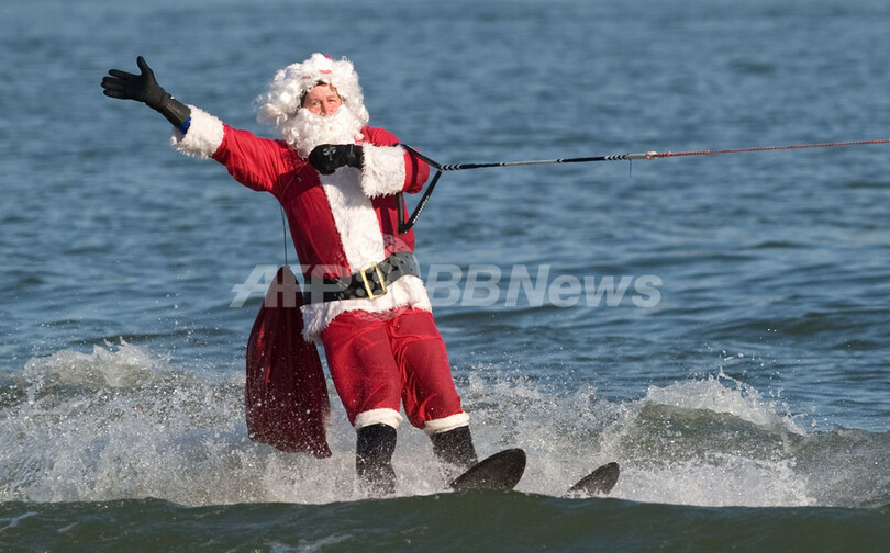 写真は、米メリーランド(Maryland)州プリンス・ジョージ郡(Prince George's County)のナショナルハーバーで、水上スキーをするサンタの格好をした男性(2009年12月24日撮影)。(c)AFP/Saul LOEB