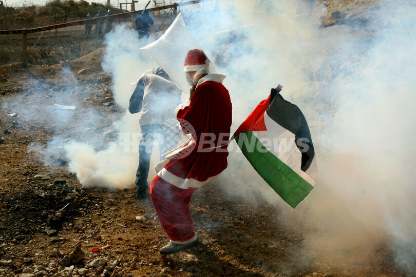 ニュース 戦争・紛争 サンタクロース姿で「分離壁」に抗議、パレスチナ自治区 2009年12月26日 17:46 発信地:ビリン/パレスチナ自治区 [ 中東・北アフリカ パレスチナ自治区 ] このニュースをシェア ‹ › ❮ 8/9 ❯ パレスチナ自治区ヨルダン川西岸(West Bank)のビリン(Bilin)で25日、パレスチナ人や外国人平和活動家らが、イスラエルの建設する分離壁への抗議デモを行った。写真は、イスラエル軍兵士に発射された催涙弾の煙をよけるためにプラスチックの袋をかぶる、パレスチナ旗を持つサンタクロース姿の抗議デモ参加者(2009年12月25日撮影)。(c)AFP/ABBAS MOMANI 画像作成中 ! 【12月26日 AFP】パレスチナ自治区ヨルダン川西岸(West Bank)のビリン(Bilin)で25日、パレスチナ人や外国人平和活動家らが、イスラエルの建設する分離壁への抗議デモを行った。(c)AFP 戦争・紛争 一覧へ> メディア・報道関係・法人の方向け 写真・動画 購入のお問合せ>