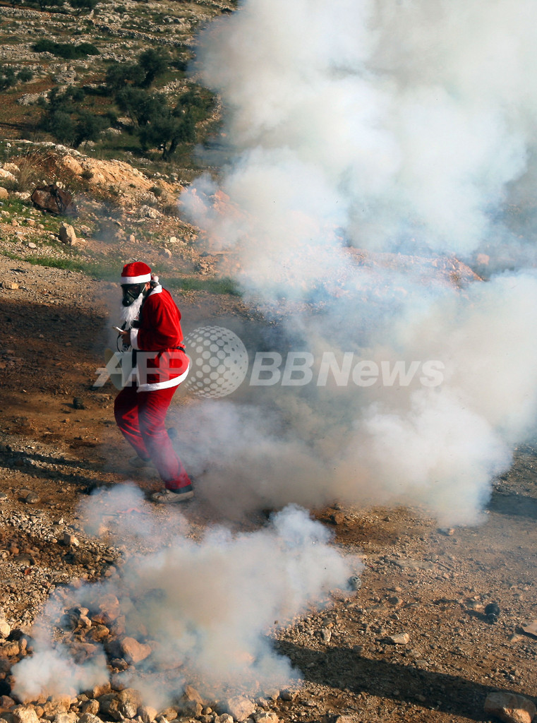 ニュース 戦争・紛争 サンタクロース姿で「分離壁」に抗議、パレスチナ自治区 2009年12月26日 17:46 発信地:ビリン/パレスチナ自治区 [ 中東・北アフリカ パレスチナ自治区 ] このニュースをシェア ‹ › ❮ 6/9 ❯ パレスチナ自治区ヨルダン川西岸(West Bank)のビリン(Bilin)で25日、パレスチナ人や外国人平和活動家らが、イスラエルの建設する分離壁への抗議デモを行った。写真は、イスラエル軍兵士に催涙弾を発射され、ガスマスクをかぶるサンタクロース姿の抗議デモ参加者(2009年12月25日撮影)。(c)AFP/ABBAS MOMANI 画像作成中 ! 【12月26日 AFP】パレスチナ自治区ヨルダン川西岸(West Bank)のビリン(Bilin)で25日、パレスチナ人や外国人平和活動家らが、イスラエルの建設する分離壁への抗議デモを行った。(c)AFP 戦争・紛争 一覧へ> メディア・報道関係・法人の方向け 写真・動画 購入のお問合せ>