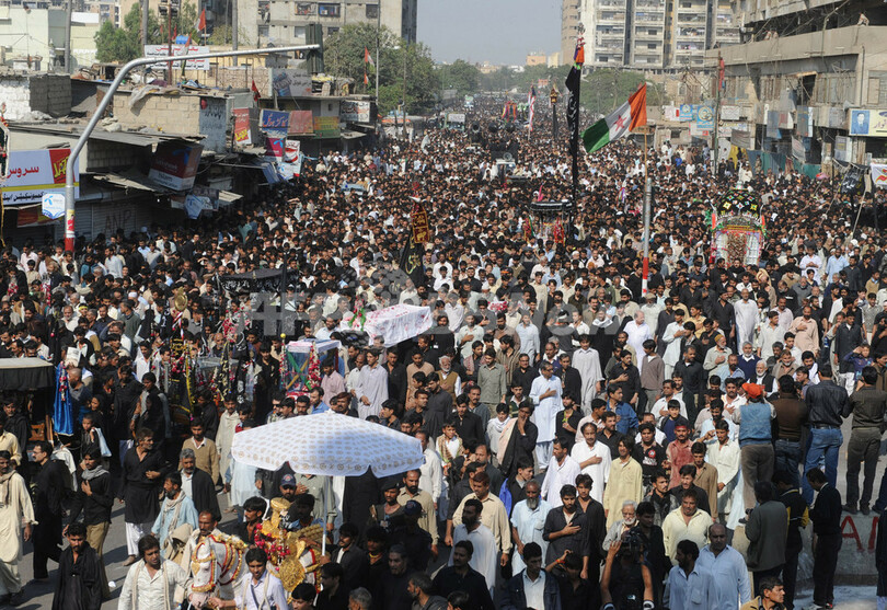 アシュラでは、シーア派教徒が7世紀の殉教者、イマーム・フセイン(Imam Hussein)を悼むが、この日カラチでは5万人を超える教徒が街頭にあふれ、黒い衣服を着て行進したり、上半身はだかになって鎖で体をたたいたりナイフで体の表面を斬りつける苦行を実践していた。
