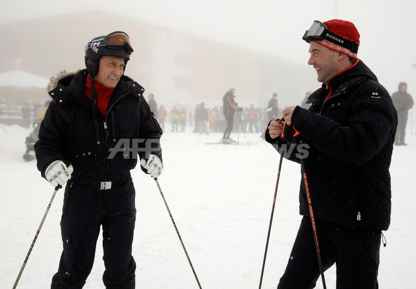 スキー場でもホットな2人、ロシアの首相と大統領