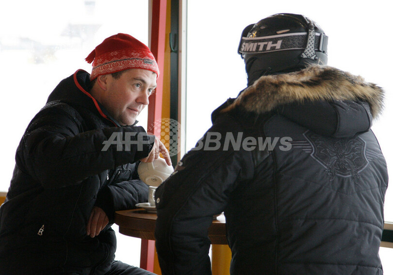 ロシアのウラジーミル・プーチン(Vladimir Putin)首相とドミトリー・メドべージェフ(Dmitry Medvedev)大統領は3日、黒海(Black Sea)沿岸のリゾート地、ソチ(Sochi)郊外にあるクラスナヤ・ポリアナ(Krasnaya Polyana)のスキー場で、仲むつまじく冬の休日を楽しんだ。写真は、スキー場のカフェで一息つく両首脳(2010年1月3日撮影)。(c)AFP/RIA-NOVOSTI/ KREMLIN/ DMITRY ASTAKHOV