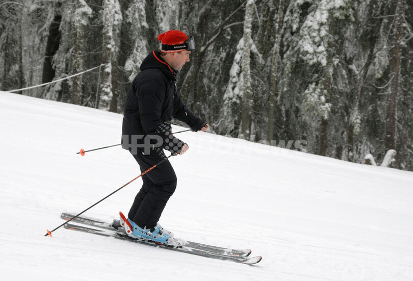 ロシアのウラジーミル・プーチン(Vladimir Putin)首相とドミトリー・メドべージェフ(Dmitry Medvedev)大統領は3日、黒海(Black Sea)沿岸のリゾート地、ソチ(Sochi)郊外にあるクラスナヤ・ポリアナ(Krasnaya Polyana)のスキー場で、仲むつまじく冬の休日を楽しんだ。写真は、スキーを楽しむメドべージェフ大統領(2010年1月3日撮影)。(c)AFP/RIA-NOVOSTI/ KREMLIN/ DMITRY ASTAKHOV