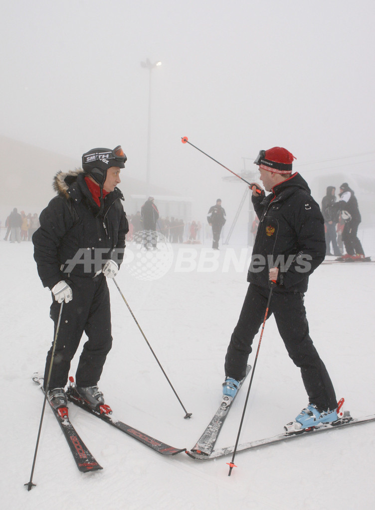 スキー場でもホットな2人、ロシアの首相と大統領