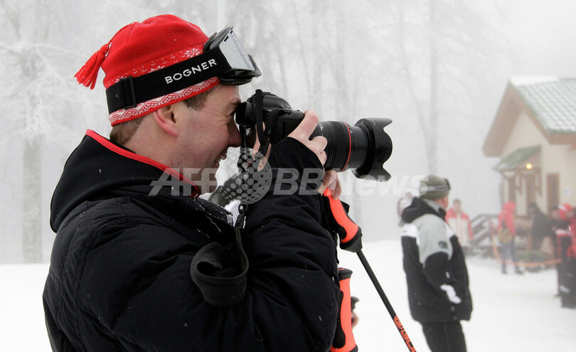 ロシアのウラジーミル・プーチン(Vladimir Putin)首相とドミトリー・メドべージェフ(Dmitry Medvedev)大統領は3日、黒海(Black Sea)沿岸のリゾート地、ソチ(Sochi)郊外にあるクラスナヤ・ポリアナ(Krasnaya Polyana)のスキー場で、仲むつまじく冬の休日を楽しんだ。写真は、写真撮影に興じるメドべージェフ大統領(2010年1月3日撮影)。(c)AFP/RIA-NOVOSTI/ KREMLIN/ DMITRY ASTAKHOV