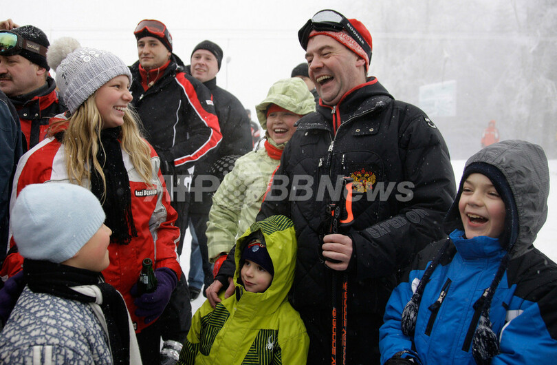 ロシアのウラジーミル・プーチン(Vladimir Putin)首相とドミトリー・メドべージェフ(Dmitry Medvedev)大統領は3日、黒海(Black Sea)沿岸のリゾート地、ソチ(Sochi)郊外にあるクラスナヤ・ポリアナ(Krasnaya Polyana)のスキー場で、仲むつまじく冬の休日を楽しんだ。写真は、スキー場で子どもたちに囲まれたメドべージェフ大統領(右から2人目、2010年1月3日撮影)。(c)AFP/RIA-NOVOSTI/ KREMLIN/ DMITRY ASTAKHOV