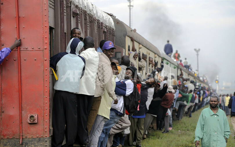 写真は首都ナイロビ(Nairobi)で、定員オーバーの電車にしがみついて通勤する人々(2010年1月5日撮影)。(c)AFP/SIMON MAINA