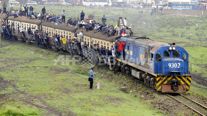 写真は首都ナイロビ(Nairobi)で、定員オーバーの電車にしがみついて通勤する人々(2010年1月5日撮影)。(c)AFP/SIMON MAINA