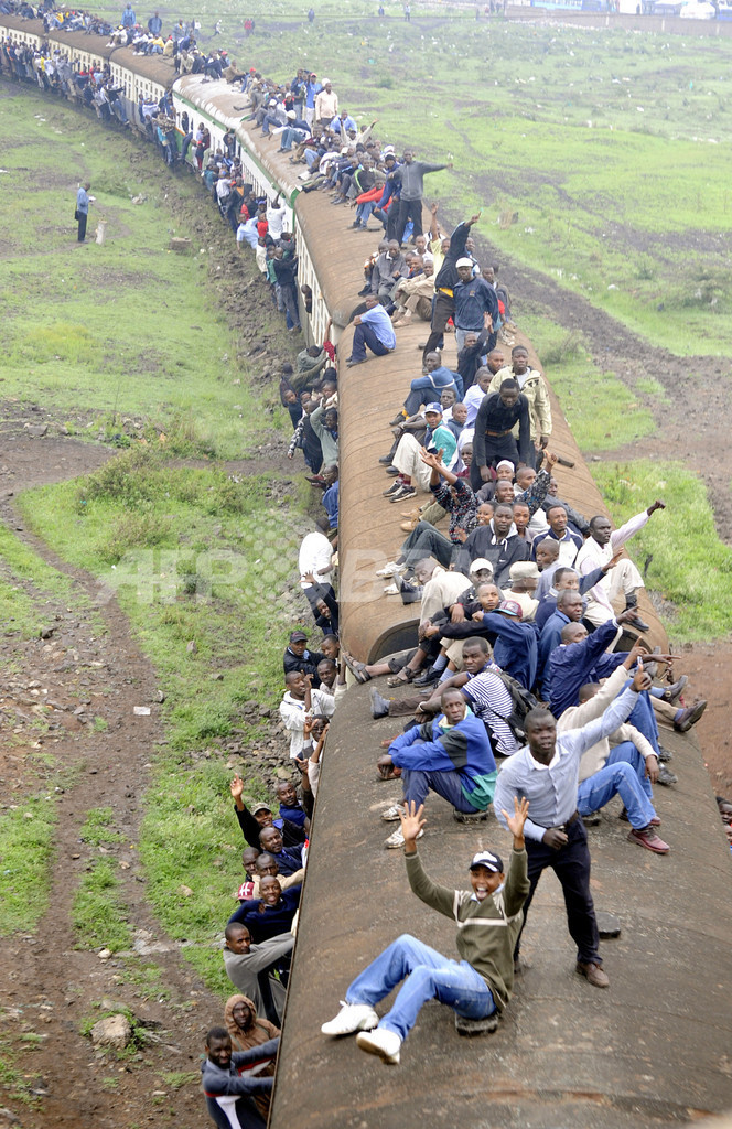 写真は首都ナイロビ(Nairobi)で、定員オーバーの電車にしがみついて通勤する人々(2010年1月5日撮影)。(c)AFP/SIMON MAINA